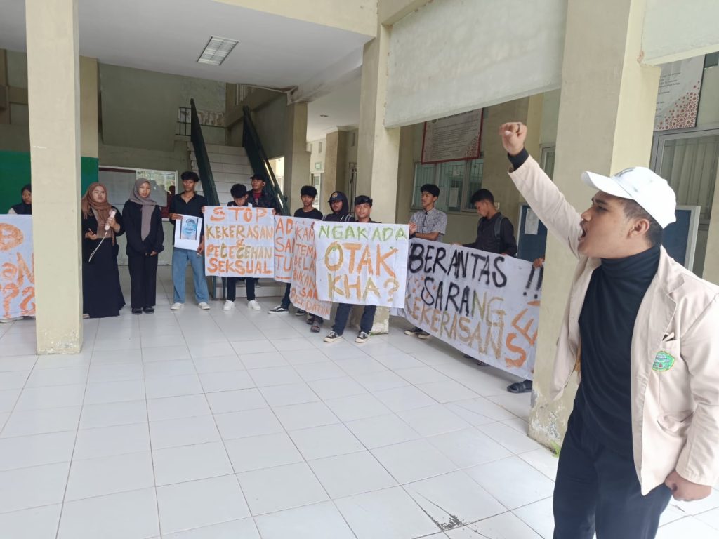 “Dengan ini, di hari ini, STAIS mencatat sejarah bahwa terduga pelaku dinyatakan di-PHK,” tegasnya di hadapan massa aksi.