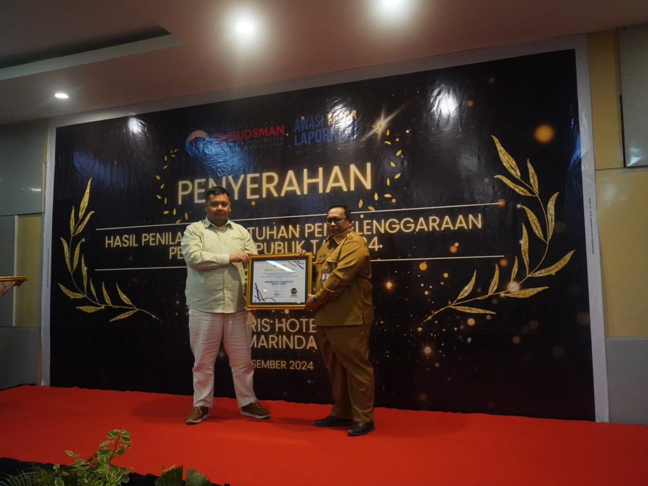 SAMARINDA – Pemerintah Kabupaten Kutai Timur (Pemkab Kutim) kembali menorehkan pencapaian positif dalam Penilaian Kepatuhan Penyelenggaraan Pelayanan Publik Tahun Anggaran 2024 yang digelar oleh Ombudsman Republik Indonesia (RI). Dalam acara penyerahan hasil penilaian yang berlangsung di Hotel Harris, Samarinda, pada Selasa (10/12/2024) Kutim berhasil meningkatkan nilainya ke kategori zona hijau dengan skor 78,38, setelah sebelumnya berada di zona kuning pada 2023.